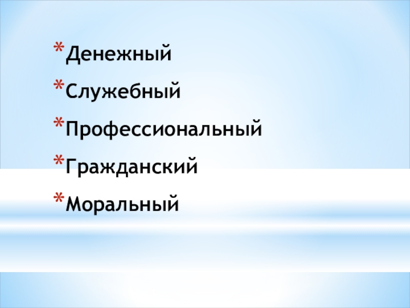 ДенежныйСлужебныйПрофессиональныйГражданскийМоральный