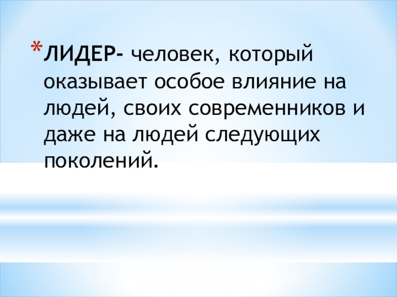 ЛИДЕР- человек, который оказывает особое влияние на людей, своих современников и даже на людей следующих поколений.