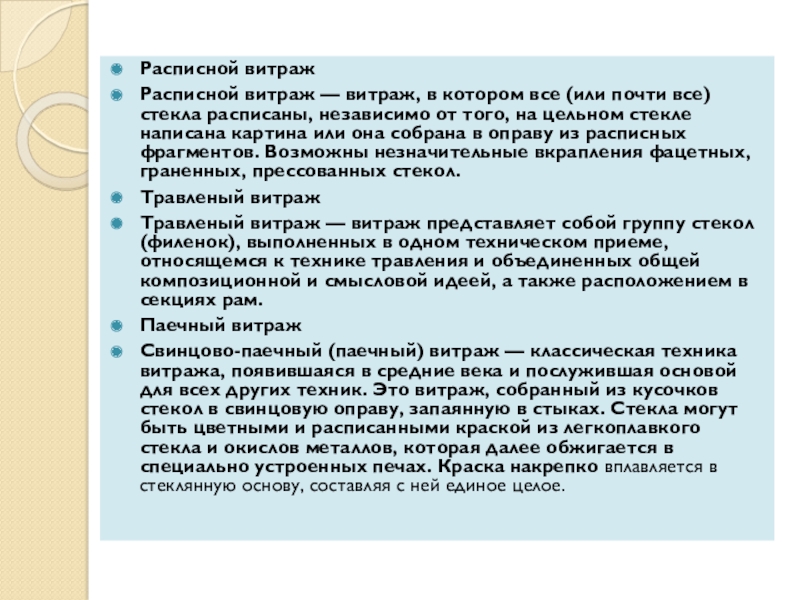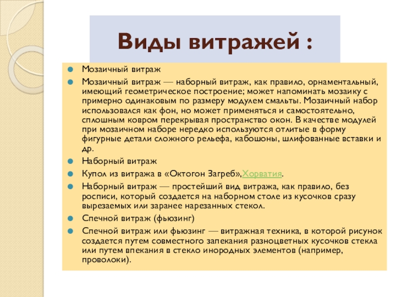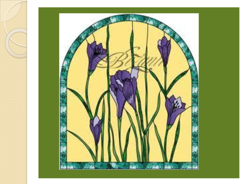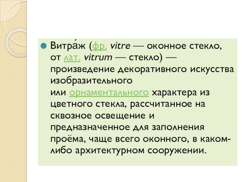 Слайд 2Витра́ж (фр. vitre — оконное стекло, от лат. vitrum — стекло) — произведение декоративного искусства изобразительного или орнаментального характера из
