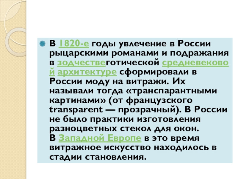 моду на витражи. Их называли тогда «транспарантными картинами» (от французского transparent — прозрачный). В России не было практики изготовления разноцветных стекол для окон. В Западной Европе в это время витражное искусство находилось в стадии становления.