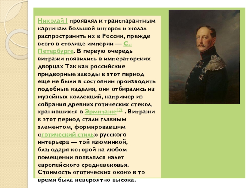 в России, прежде всего в столице империи — С.-Петербурге. В первую очередь витражи появились в императорских дворцах Так как российские придворные заводы в этот период еще не были в состоянии производить подобные изделия, они отбирались из музейных коллекций, например из собрания древних готических стекол, хранившихся в Эрмитаже[2] . Витражи в этот период стали главным элементом, формировавшим «готический стиль» русского интерьера — той изюминкой, благодаря которой на любом помещении появлялся налет европейского средневековья. Стоимость «готических окон» в то время была невероятно высока.