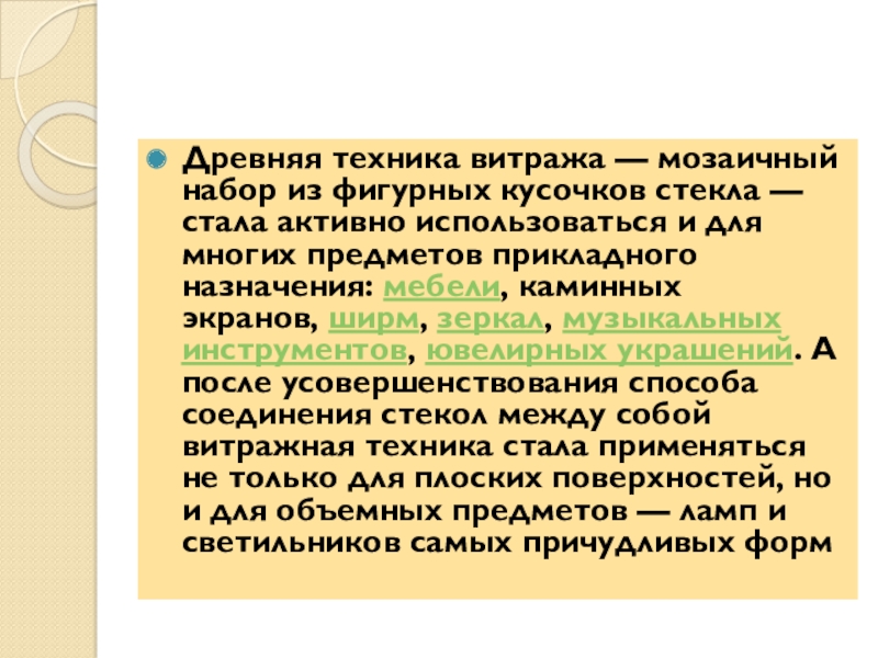 использоваться и для многих предметов прикладного назначения: мебели, каминных экранов, ширм, зеркал, музыкальных инструментов, ювелирных украшений. А после усовершенствования способа соединения стекол между собой витражная техника стала применяться не только для плоских поверхностей, но и для объемных предметов — ламп и светильников самых причудливых форм