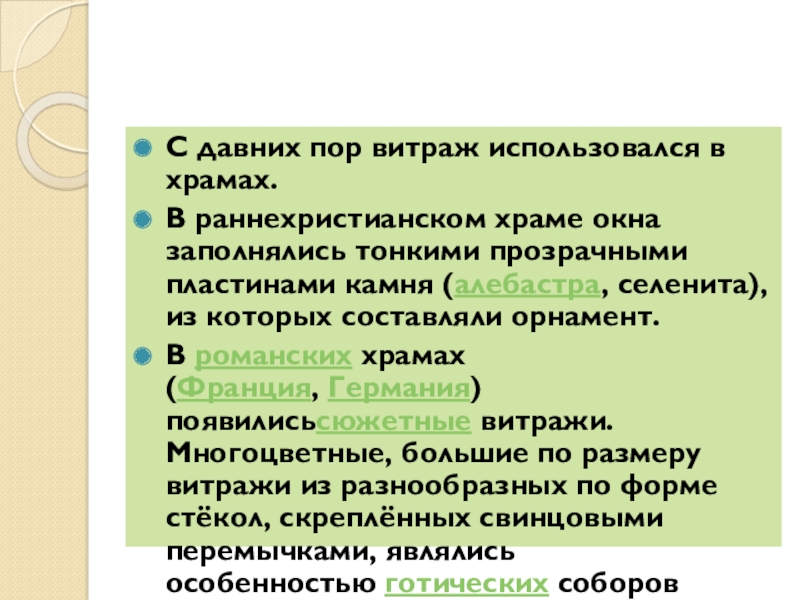 В романских храмах (Франция, Германия) появилисьсюжетные витражи. Многоцветные, большие по размеру витражи из разнообразных по форме стёкол, скреплённых свинцовыми перемычками, являлись особенностью готических соборов