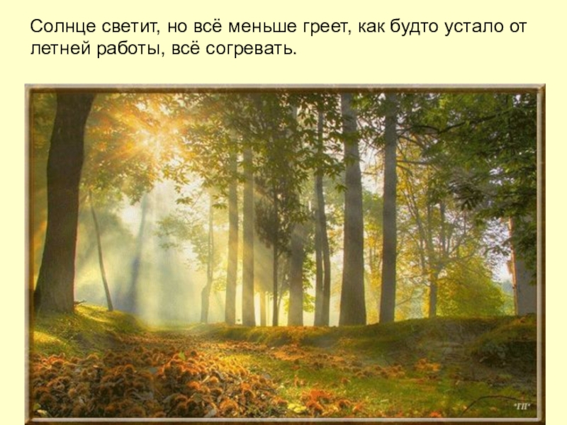 Слайд 2Солнце светит, но всё меньше греет, как будто устало от летней