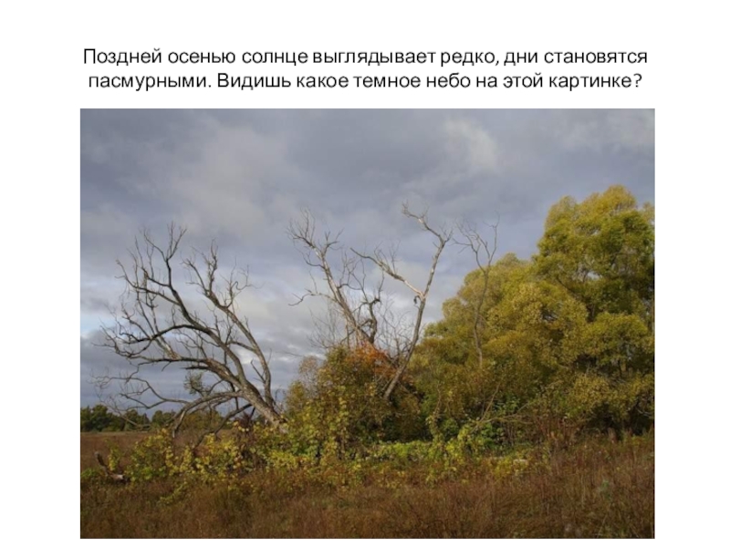 Слайд 10Поздней осенью солнце выглядывает редко, дни становятся пасмурными. Видишь какое темное