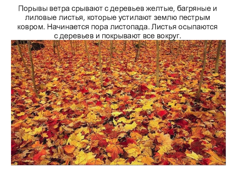 Слайд 8Порывы ветра срывают с деревьев желтые, багряные и лиловые листья, которые