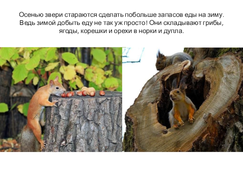 Слайд 14Осенью звери стараются сделать побольше запасов еды на зиму. Ведь зимой