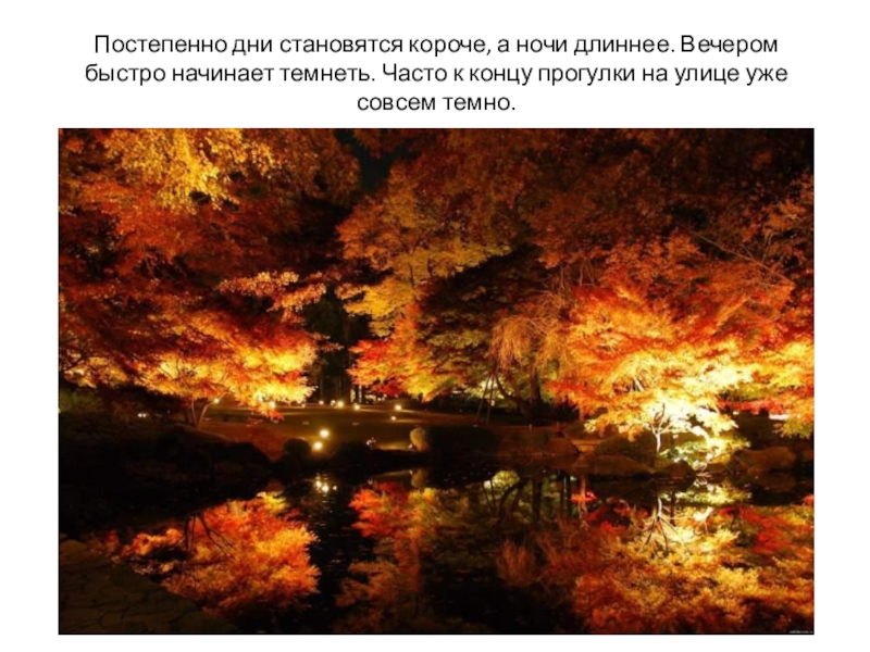 Слайд 5Постепенно дни становятся короче, а ночи длиннее. Вечером быстро начинает темнеть.