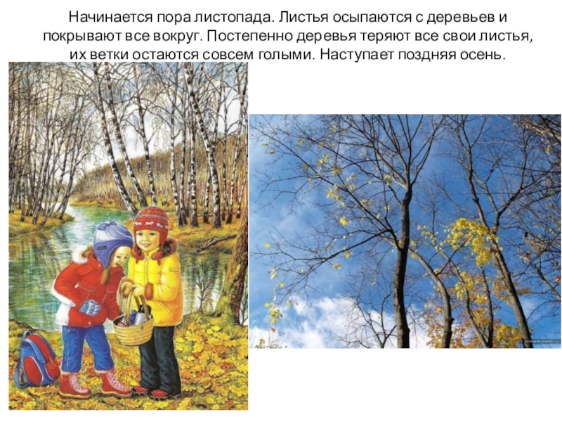 Слайд 9Начинается пора листопада. Листья осыпаются с деревьев и покрывают все вокруг.