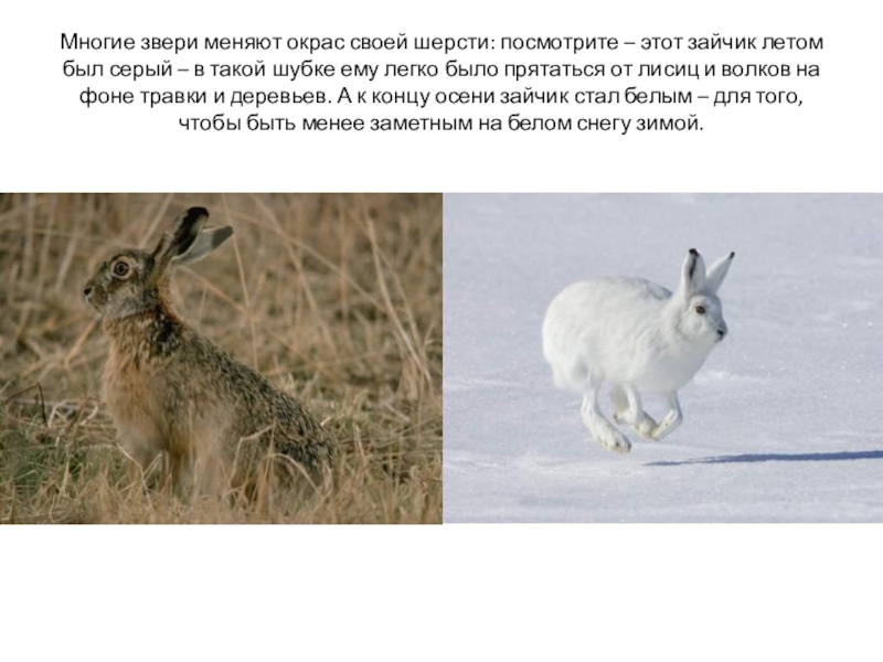 Слайд 13Многие звери меняют окрас своей шерсти: посмотрите – этот зайчик летом