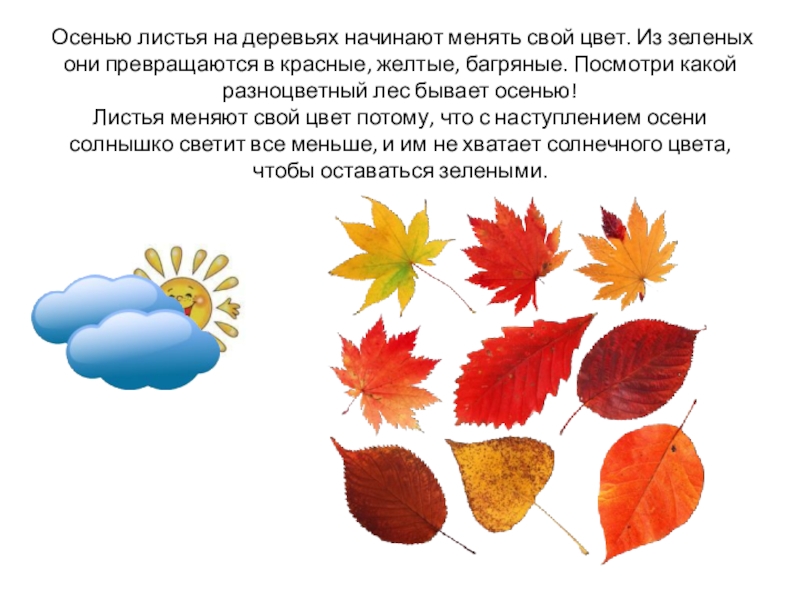 превращаются в красные, желтые, багряные. Посмотри какой разноцветный лес бывает осенью! Листья меняют свой цвет потому, что с наступлением осени солнышко светит все меньше, и им не хватает солнечного цвета, чтобы оставаться зелеными.