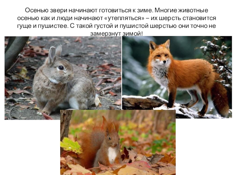 Осенью звери начинают готовиться к зиме. Многие животные осенью как и люди начинают «утепляться» – их шерсть