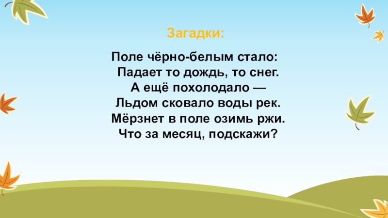 Загадки:Поле чёрно-белым стало: Падает то дождь, то снег. А ещё похолодало — Льдом сковало воды рек.