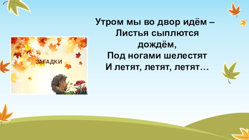 Утром мы во двор идём – Листья сыплются дождём, Под ногами шелестят И летят, летят, летят…