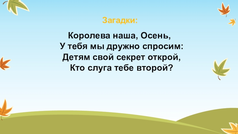 Загадки:Королева наша, Осень, У тебя мы дружно спросим: Детям свой секрет открой, Кто слуга тебе второй?