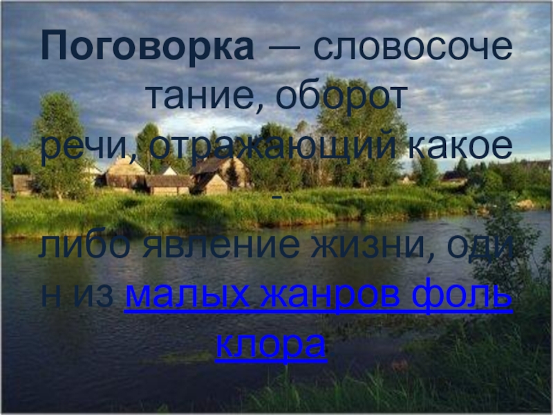 Слайд 2Поговорка — словосочетание, оборот  речи, отражающий какое-либо явление жизни, один из малых жанров фольклора.