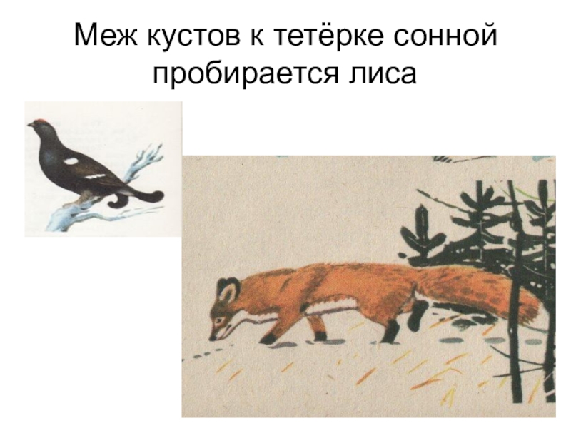 Слайд 7Меж кустов к тетёрке сонной пробирается лиса