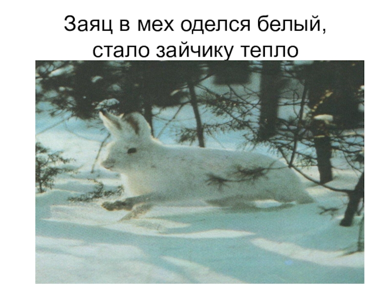 Слайд 4Заяц в мех оделся белый, стало зайчику тепло