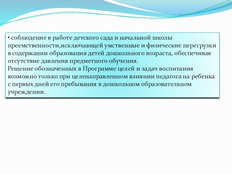 Слайд 7• соблюдение в работе детского сада и начальной школы преемственности,исключающей умственные