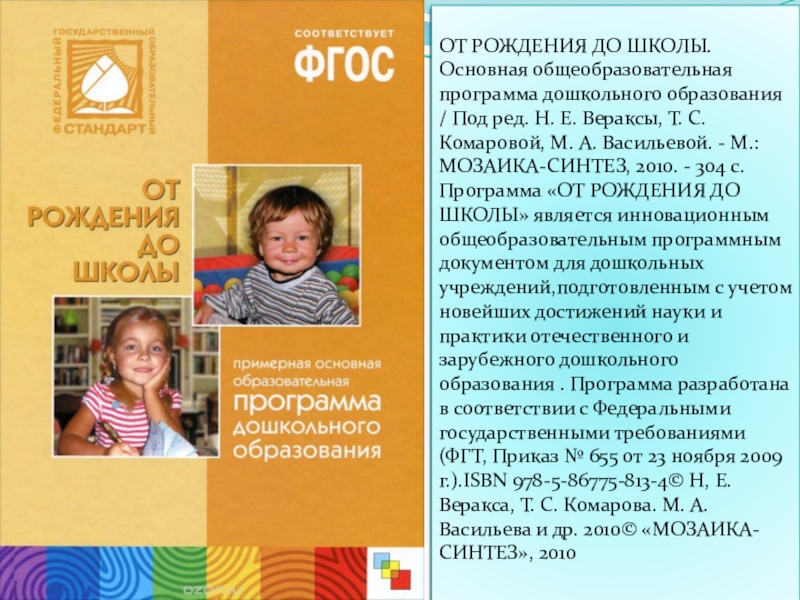 ред. Н. Е. Вераксы, Т. С. Комаровой, М. А. Васильевой. - М.:МОЗАИКА-СИНТЕЗ, 2010. - 304 с.Программа «ОТ РОЖДЕНИЯ ДО ШКОЛЫ» является инновационным общеобразовательным программным документом для дошкольных учреждений,подготовленным с учетом новейших достижений науки и практики отечественного и зарубежного дошкольного образования . Программа разработана в соответствии с Федеральными государственными требованиями(ФГТ, Приказ № 655 от 23 ноября 2009 г.).ISBN 978-5-86775-813-4© Н, Е. Веракса, Т. С. Комарова. М. А. Васильева и др. 2010© «МОЗАИКА-СИНТЕЗ», 2010