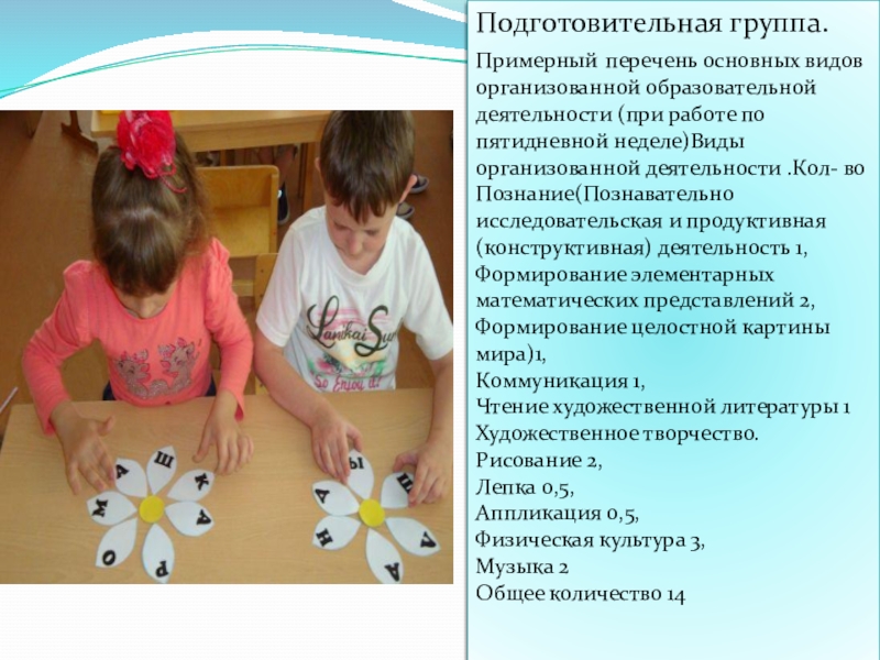 Слайд 28Подготовительная группа. Примерный перечень основных видов организованной образовательной деятельности (при работе
