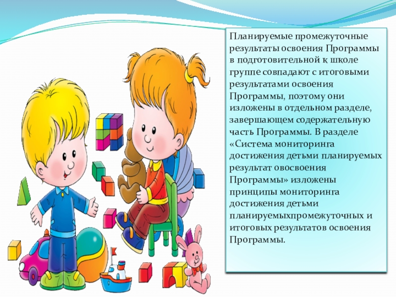 Слайд 10Планируемые промежуточные результаты освоения Программы в подготовительной к школе группе совпадают