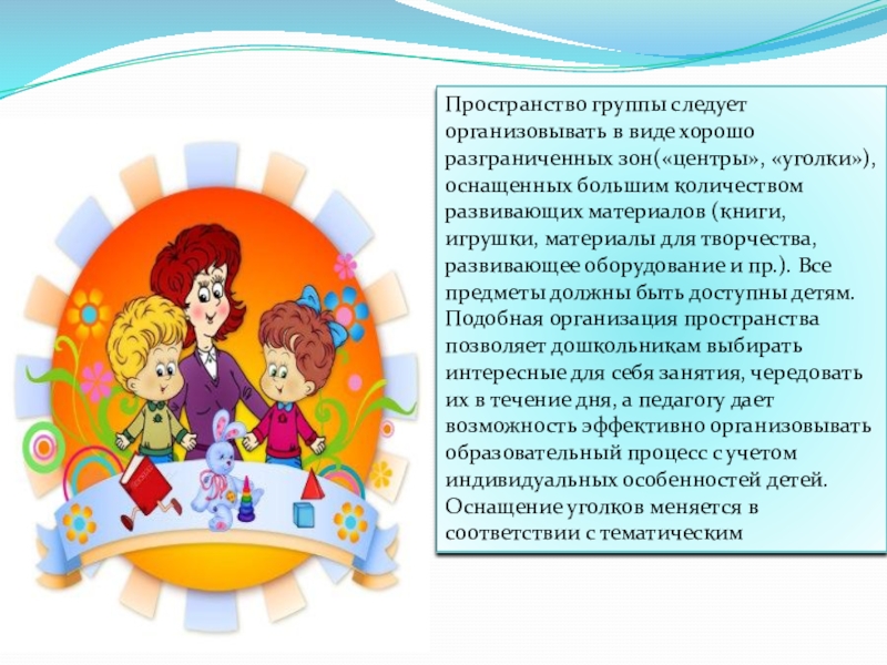 большим количеством развивающих материалов (книги, игрушки, материалы для творчества, развивающее оборудование и пр.). Все предметы должны быть доступны детям. Подобная организация пространства позволяет дошкольникам выбирать интересные для себя занятия, чередовать их в течение дня, а педагогу дает возможность эффективно организовывать образовательный процесс с учетом индивидуальных особенностей детей. Оснащение уголков меняется в соответствии с тематическим