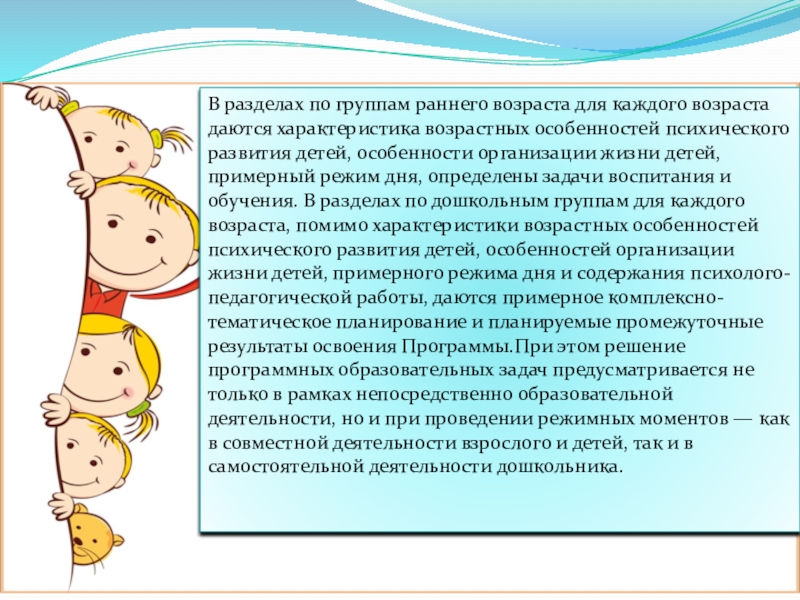 В разделах по группам раннего возраста для каждого возраста даются характеристика возрастных особенностей психического развития детей, особенности организации жизни детей, примерный режим дня, определены задачи воспитания и обучения. В разделах по дошкольным группам для каждого возраста, помимо характеристики возрастных особенностей психического развития детей, особенностей организации жизни детей, примерного режима дня и содержания психолого-педагогической работы, даются примерное комплексно-тематическое планирование и планируемые промежуточные результаты освоения Программы.При этом решение программных образовательных задач предусматривается не только в рамках непосредственно образовательной деятельности, но и при проведении режимных моментов — как в совместной деятельности взрослого и детей, так и в самостоятельной деятельности дошкольника.
