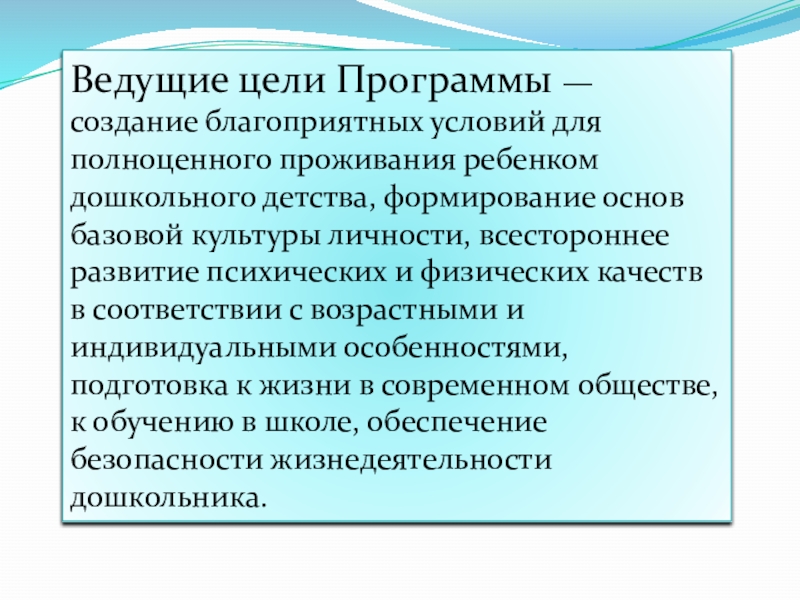 дошкольного детства, формирование основ базовой культуры личности, всестороннее развитие психических и физических качеств в соответствии с возрастными и индивидуальными особенностями, подготовка к жизни в современном обществе, к обучению в школе, обеспечение безопасности жизнедеятельности дошкольника.