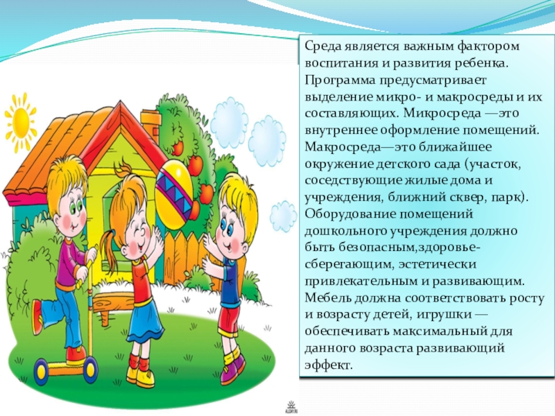 Слайд 13Среда является важным фактором воспитания и развития ребенка. Программа предусматривает выделение