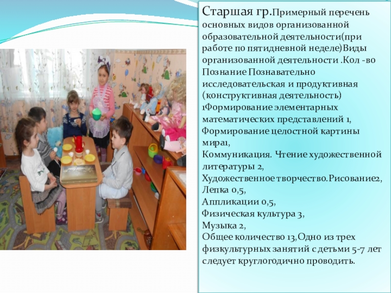 Слайд 27Старшая гр.Примерный перечень основных видов организованной образовательной деятельности(при работе по пятидневной