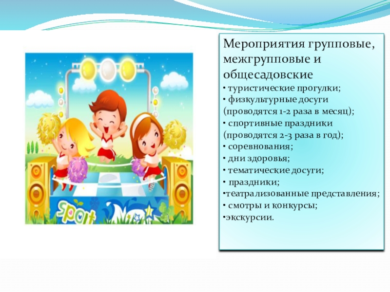 Слайд 21Мероприятия групповые, межгрупповые и общесадовские