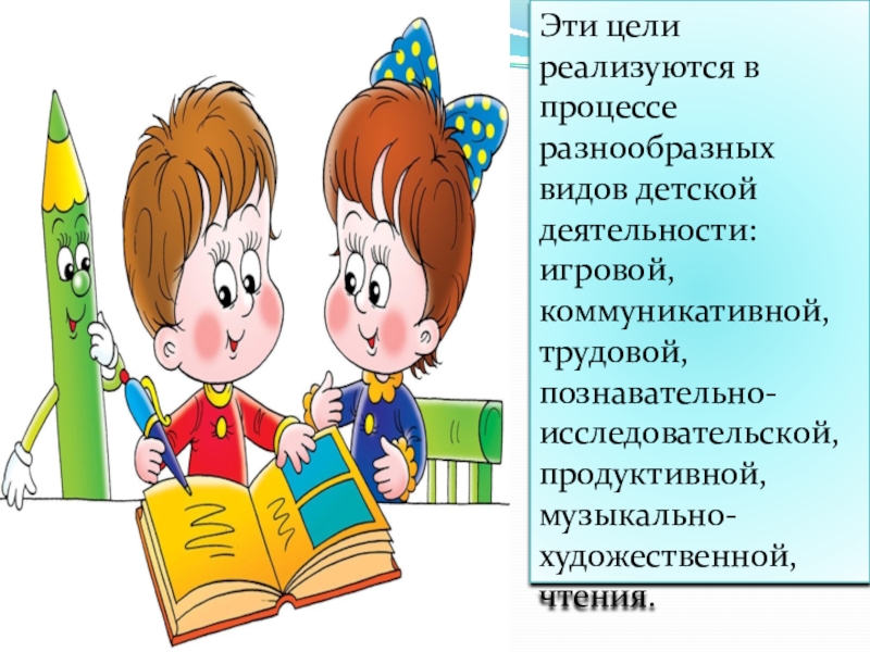 Слайд 5Эти цели реализуются в процессе разнообразных видов детской деятельности: игровой,коммуникативной, трудовой,