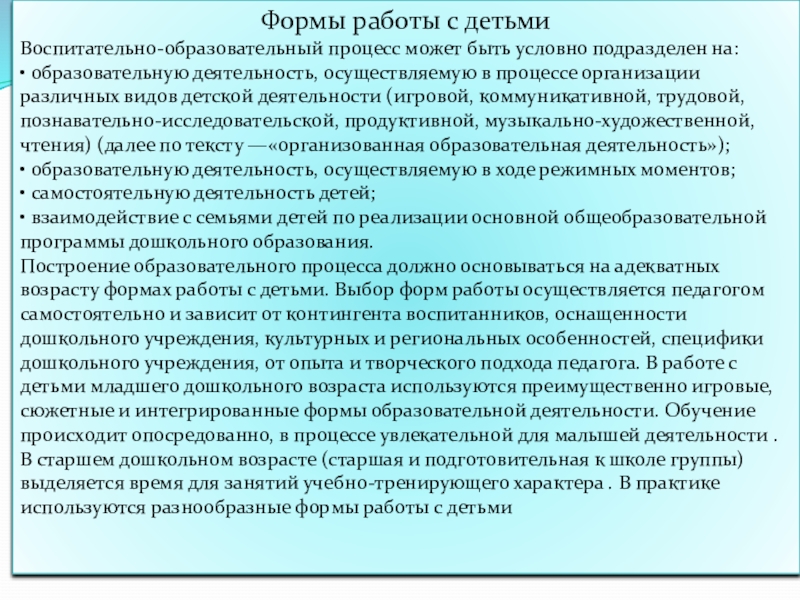 Построение образовательного процесса должно основываться на адекватных возрасту формах работы с детьми. Выбор форм работы осуществляется педагогом самостоятельно и зависит от контингента воспитанников, оснащенности дошкольного учреждения, культурных и региональных особенностей, специфики дошкольного учреждения, от опыта и творческого подхода педагога. В работе с детьми младшего дошкольного возраста используются преимущественно игровые, сюжетные и интегрированные формы образовательной деятельности. Обучение происходит опосредованно, в процессе увлекательной для малышей деятельности . В старшем дошкольном возрасте (старшая и подготовительная к школе группы)выделяется время для занятий учебно-тренирующего характера . В практике используются разнообразные формы работы с детьми