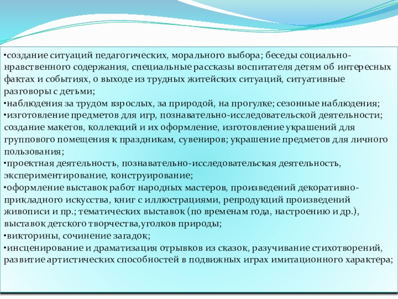 Слайд 18•создание ситуаций педагогических, морального выбора; беседы социально-нравственного содержания, специальные рассказы воспитателя