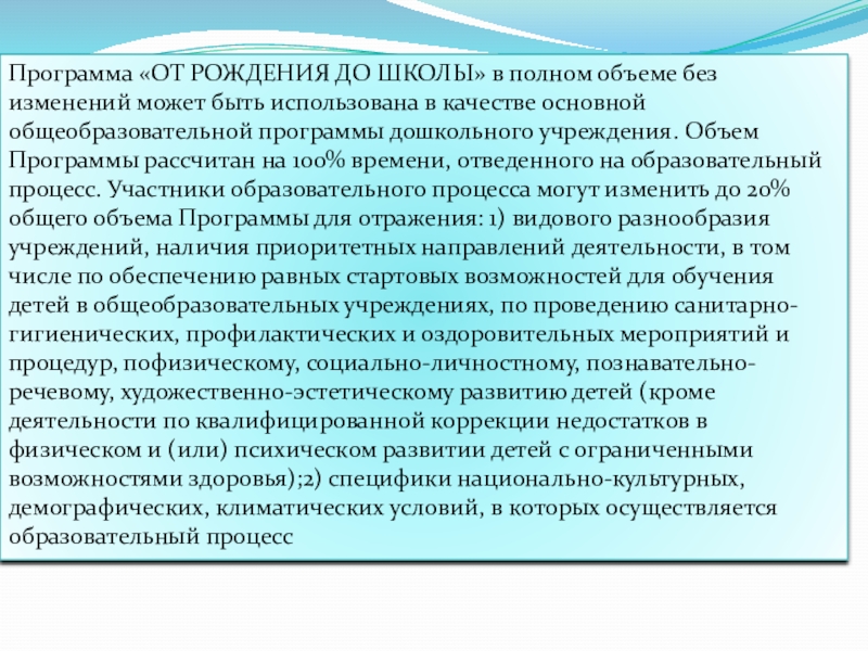 быть использована в качестве основной общеобразовательной программы дошкольного учреждения. Объем Программы рассчитан на 100% времени, отведенного на образовательный процесс. Участники образовательного процесса могут изменить до 20% общего объема Программы для отражения: 1) видового разнообразия учреждений, наличия приоритетных направлений деятельности, в том числе по обеспечению равных стартовых возможностей для обучения детей в общеобразовательных учреждениях, по проведению санитарно-гигиенических, профилактических и оздоровительных мероприятий и процедур, пофизическому, социально-личностному, познавательно-речевому, художественно-эстетическому развитию детей (кроме деятельности по квалифицированной коррекции недостатков в физическом и (или) психическом развитии детей с ограниченными возможностями здоровья);2) специфики национально-культурных, демографических, климатических условий, в которых осуществляется образовательный процесс