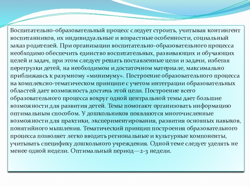 особенности, социальный заказ родителей. При организации воспитательно-образовательного процесса необходимо обеспечить единство воспитательных, развивающих и обучающих целей и задач, при этом следует решать поставленные цели и задачи, избегая перегрузки детей, на необходимом и достаточном материале, максимально приближаясь к разумному «минимуму». Построение образовательного процесса на комплексно-тематическом принципе с учетом интеграции образовательных областей дает возможность достичь этой цели. Построение всего образовательного процесса вокруг одной центральной темы дает большие возможности для развития детей. Темы помогают организовать информацию оптимальным способом. У дошкольников появляются многочисленные возможности для практики, экспериментирования, развития основных навыков, понятийного мышления. Тематический принцип построения образовательного процесса позволяет легко вводить региональные и культурные компоненты, учитывать специфику дошкольного учреждения. Одной теме следует уделять не менее одной недели. Оптимальный период—2-3 недели.