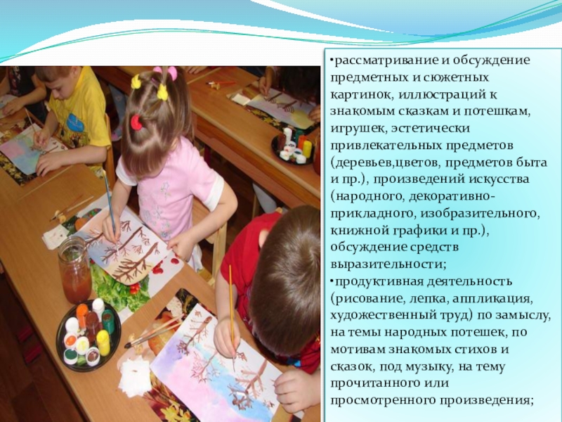 и потешкам, игрушек, эстетически привлекательных предметов (деревьев,цветов, предметов быта и пр.), произведений искусства (народного, декоративно-прикладного, изобразительного, книжной графики и пр.), обсуждение средств выразительности;