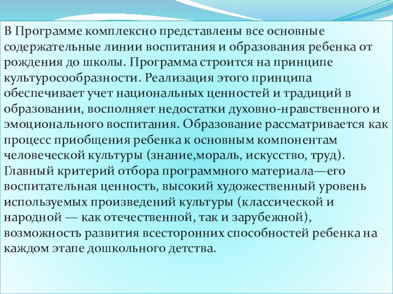 ребенка от рождения до школы. Программа строится на принципе культуросообразности. Реализация этого принципа обеспечивает учет национальных ценностей и традиций в образовании, восполняет недостатки духовно-нравственного и эмоционального воспитания. Образование рассматривается как процесс приобщения ребенка к основным компонентам человеческой культуры (знание,мораль, искусство, труд). Главный критерий отбора программного материала—его воспитательная ценность, высокий художественный уровень используемых произведений культуры (классической и народной — как отечественной, так и зарубежной), возможность развития всесторонних способностей ребенка на каждом этапе дошкольного детства.