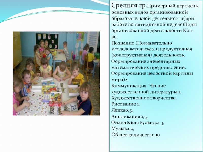 Слайд 26Средняя гр.Примерный перечень основных видов организованной образовательной деятельности(при работе по пятидневной