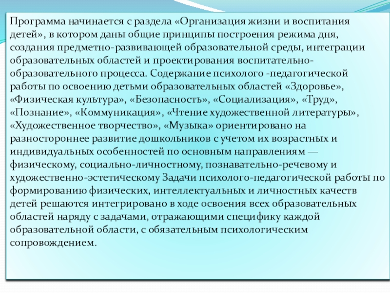 даны общие принципы построения режима дня, создания предметно-развивающей образовательной среды, интеграции образовательных областей и проектирования воспитательно-образовательного процесса. Содержание психолого -педагогической работы по освоению детьми образовательных областей «Здоровье», «Физическая культура», «Безопасность», «Социализация», «Труд», «Познание», «Коммуникация», «Чтение художественной литературы», «Художественное творчество», «Музыка» ориентировано на разностороннее развитие дошкольников с учетом их возрастных и индивидуальных особенностей по основным направлениям — физическому, социально-личностному, познавательно-речевому и художественно-эстетическому Задачи психолого-педагогической работы по формированию физических, интеллектуальных и личностных качеств детей решаются интегрировано в ходе освоения всех образовательных областей наряду с задачами, отражающими специфику каждой образовательной области, с обязательным психологическим сопровождением.