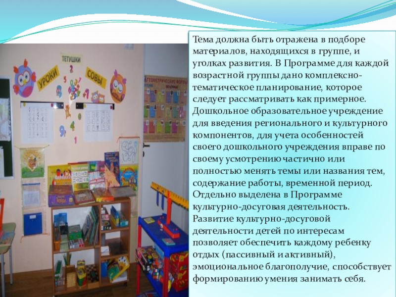 уголках развития. В Программе для каждой возрастной группы дано комплексно-тематическое планирование, которое следует рассматривать как примерное. Дошкольное образовательное учреждение для введения регионального и культурного компонентов, для учета особенностей своего дошкольного учреждения вправе по своему усмотрению частично или полностью менять темы или названия тем, содержание работы, временной период. Отдельно выделена в Программе культурно-досуговая деятельность. Развитие культурно-досуговой деятельности детей по интересам позволяет обеспечить каждому ребенку отдых (пассивный и активный), эмоциональное благополучие, способствует формированию умения занимать себя.