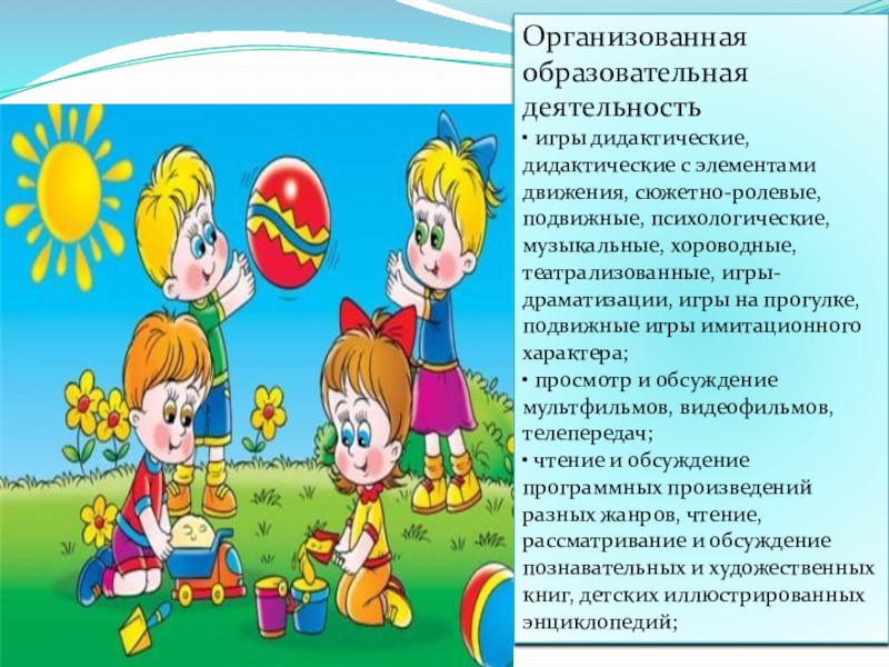 • игры дидактические, дидактические с элементами движения, сюжетно-ролевые, подвижные,