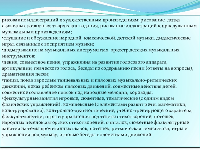 •танцы, показ взрослым танцевальных и плясовых музыкально-ритмических движений, показ ребенком плясовых движений, совместные действия детей, совместное составление плясок под народные мелодии, хороводы;