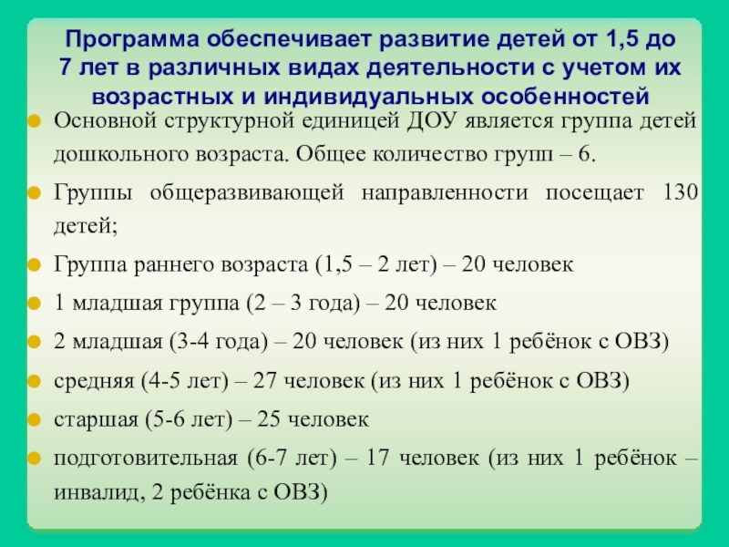 подготовительная (6-7 лет) – 17 человек (из них 1 ребёнок – инвалид, 2 ребёнка с ОВЗ)