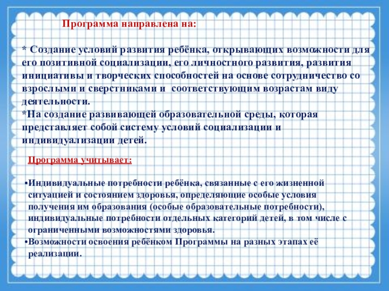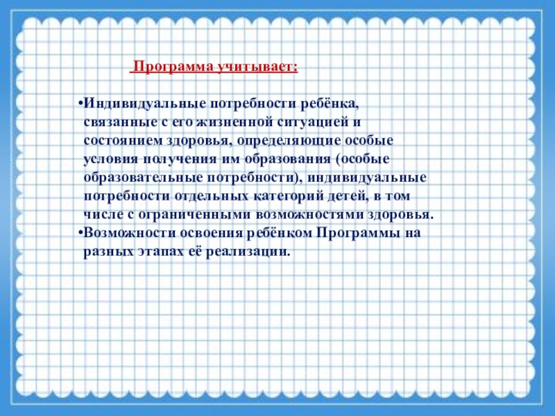 Индивидуальные потребности ребёнка, связанные с его жизненной ситуацией и состоянием здоровья, определяющие особые условия получения им образования (особые образовательные потребности), индивидуальные потребности отдельных категорий детей, в том числе с ограниченными возможностями здоровья.