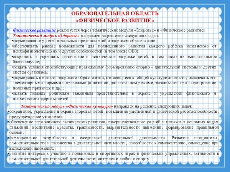 Тематический модуль «Физическая культура» направлен на решение следующих задач: