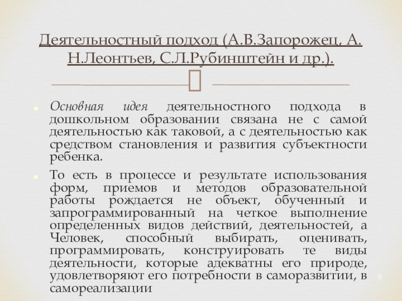 Деятельностный подход (А.В.Запорожец, А.Н.Леонтьев, С.Л.Рубинштейн и др.).