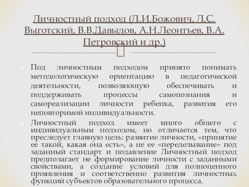 Личностный подход (Л.И.Божович, Л.С.Выготский, В.В.Давыдов, А.Н.Леонтьев, В.А.Петровский и др.)