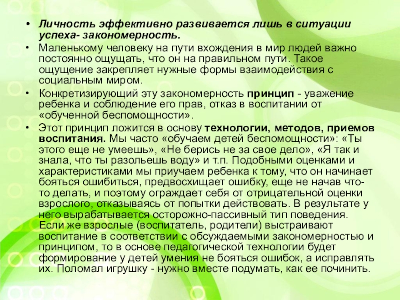 Этот принцип ложится в основу технологии, методов, приемов воспитания. Мы часто «обучаем детей беспомощности»: «Ты этого еще не умеешь», «Не берись не за свое дело», «Я так и знала, что ты разольешь воду» и т.п. Подобными оценками и характеристиками мы приучаем ребенка к тому, что он начинает бояться ошибиться, предвосхищает ошибку, еще не начав что-то делать, и поэтому ограждает себя от отрицательной оценки взрослого, отказываясь от попытки действовать. В результате у него вырабатывается осторожно-пассивный тип поведения. Если же взрослые (воспитатель, родители) выстраивают воспитание в соответствии с обсуждаемыми закономерностью и принципом, то в основе педагогической технологии будет формирование у детей умения не бояться ошибок, а исправлять их. Поломал игрушку - нужно вместе подумать, как ее починить.